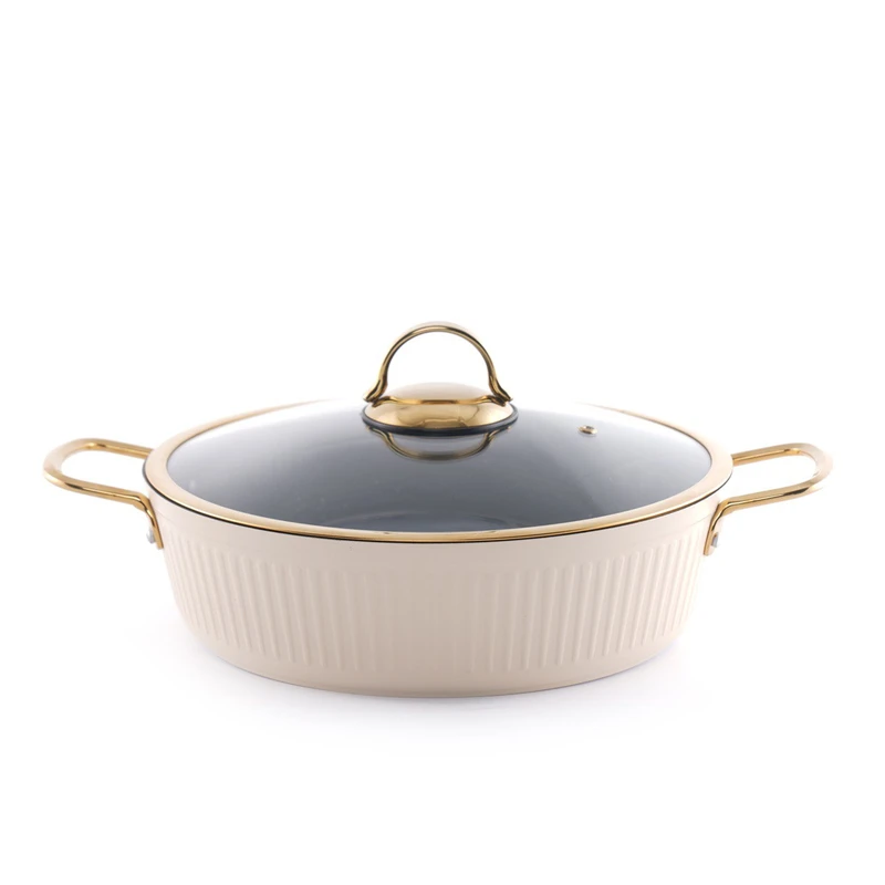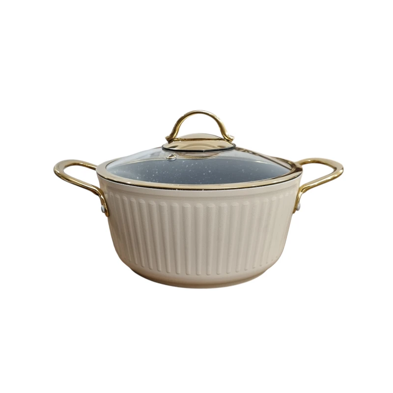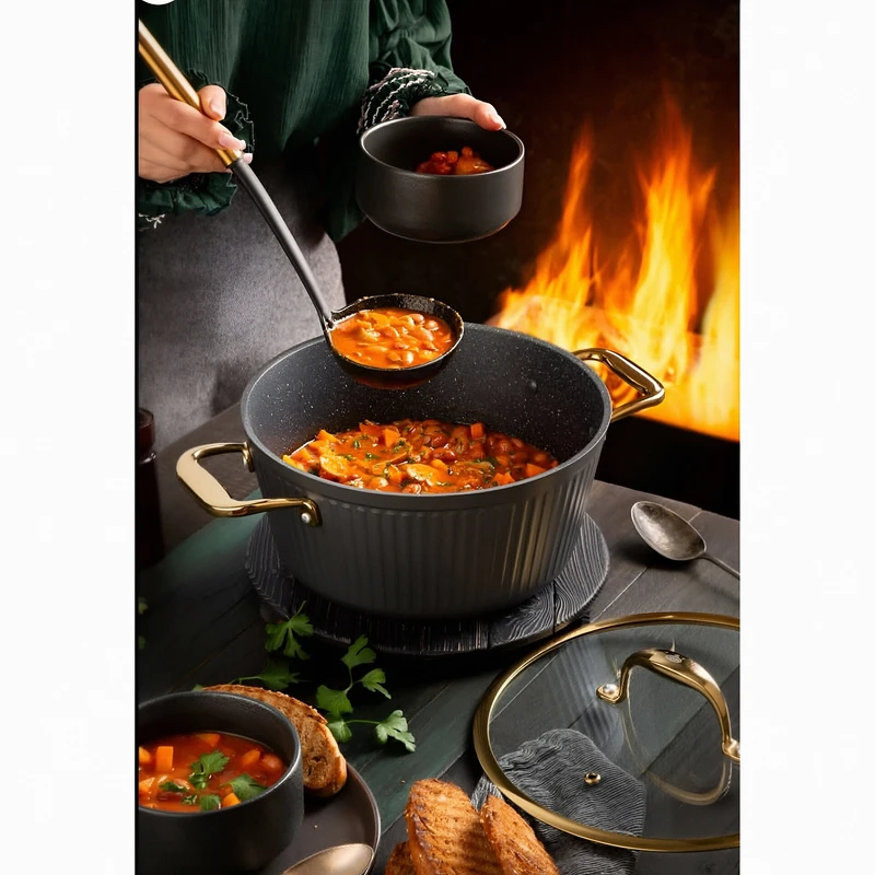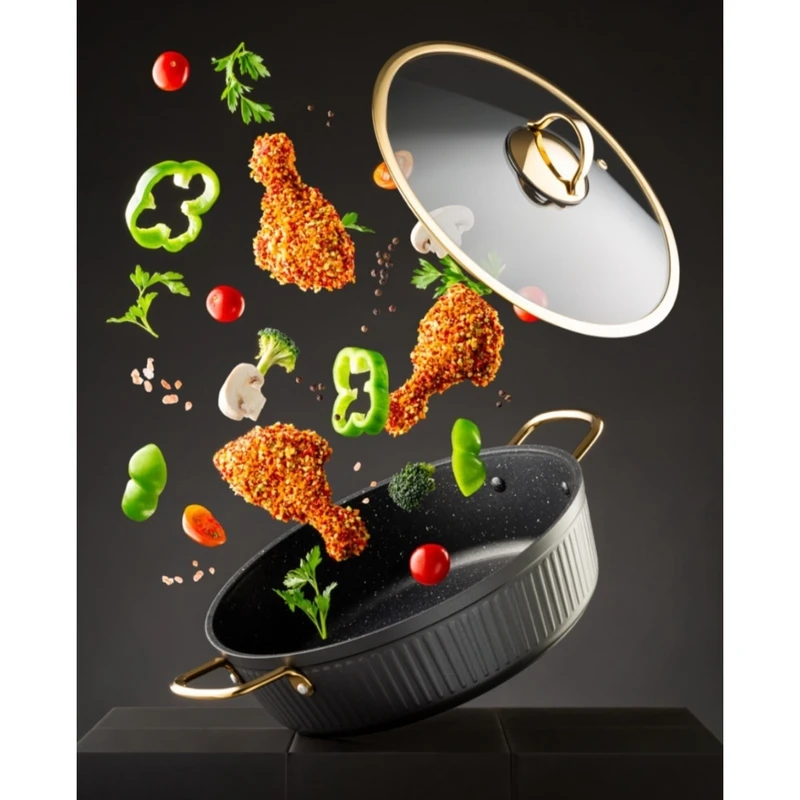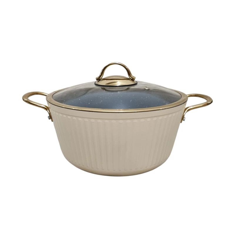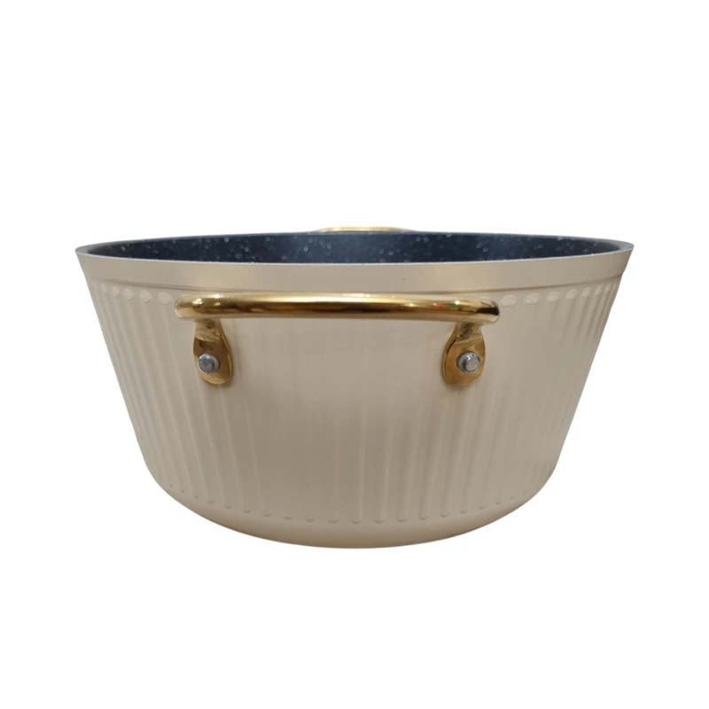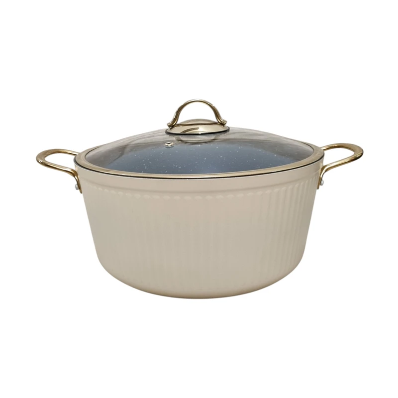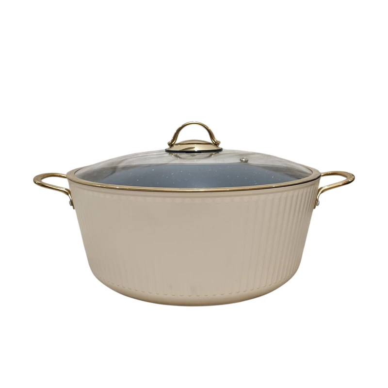 این سرویس پخت و پز شامل 4 عدد قابلمه در سایزهای 20، 24، 28 و 32 سانتیمتر و یک تابه دو دسته و یک تابه تک دسته در سایز 28 سانتیمتر است که با روکش داخلی گرانیت پوشانده شدهاند. جنس بدنه آلومینیومی این ظروف، علاوه بر وزن سبک، مقاومت بالایی در برابر حرارت و ضربه دارد. دربهای پیرکس با سوپاپ تخلیه بخار، امکان مشاهده مراحل پخت را فراهم کرده و از تجمع بخار جلوگیری میکنند. طراحی نچسب داخلی، پختوپز سالم و بدون نیاز به روغن زیاد را ممکن میسازد.