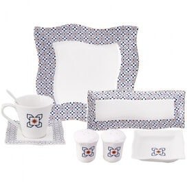 بشقاب بزرگ: 6 عدد ، فنجان چای خوری: 6 عدد ، زیر فنجانی: 6 عدد ، قاشق چای خوری: 6 عدد ، زیتون خوری: 2 عدد ، پنیر خوری: 2عدد ، مربا خوری: 2 عدد ، نمک پاش: 1 عدد ، فلفل پاش: 1 عدد